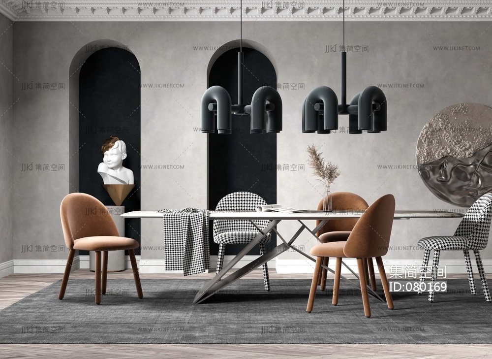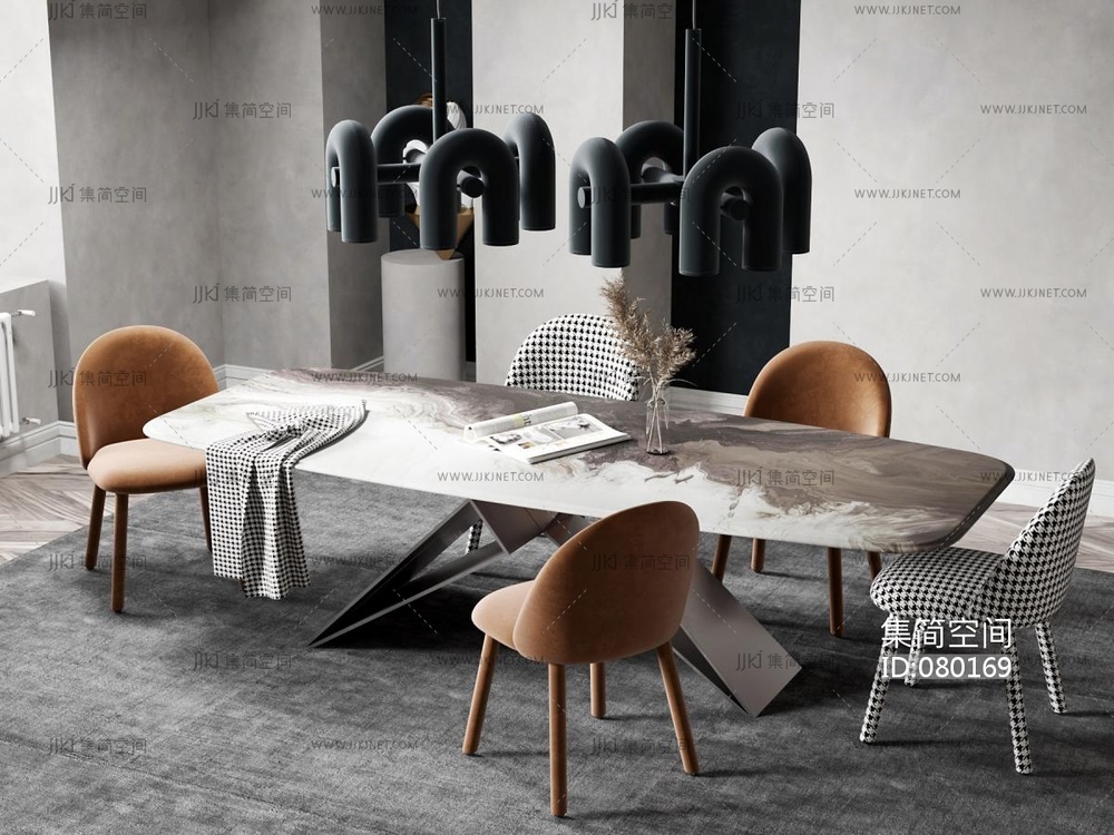 北欧现代轻奢餐厅,餐桌椅,长条桌吊灯 3d模型下载 [模型ID:80169]