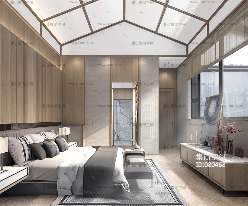 新中式卧室老人房,双人床 3d模型下载 [模型ID:80468]