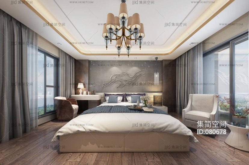 新中式轻奢卧室,双人床 3d模型下载 [模型ID:80678]