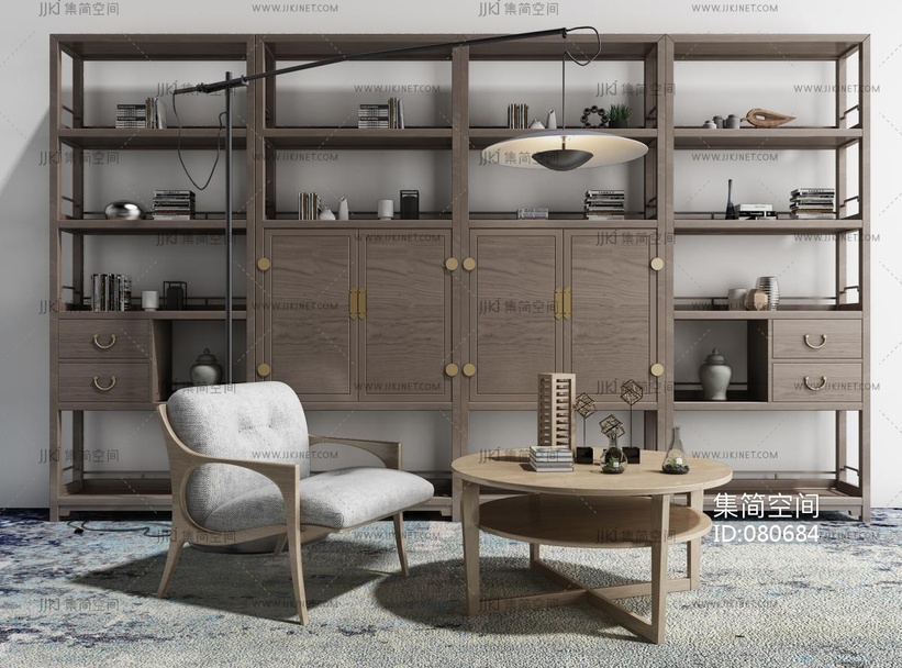 新中式休息沙发椅子茶几中式书柜 3d模型下载 [模型ID:80684]