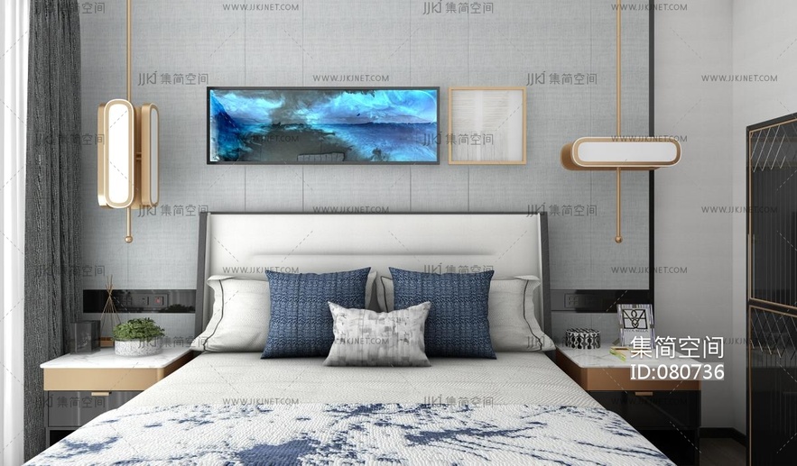现代轻奢新中式双人床床头柜,小吊灯 3d模型下载 [模型ID:80736]