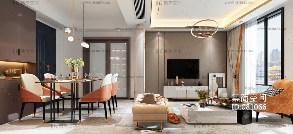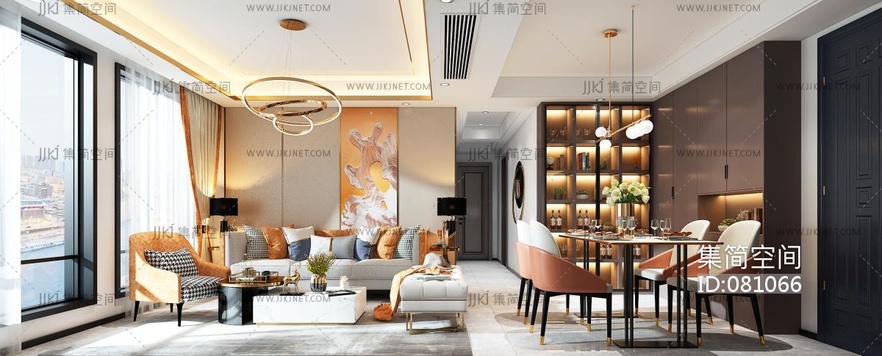 现代轻奢客餐厅,橘色沙发,玻璃酒柜,餐桌椅 3d模型下载 [模型ID:81066]