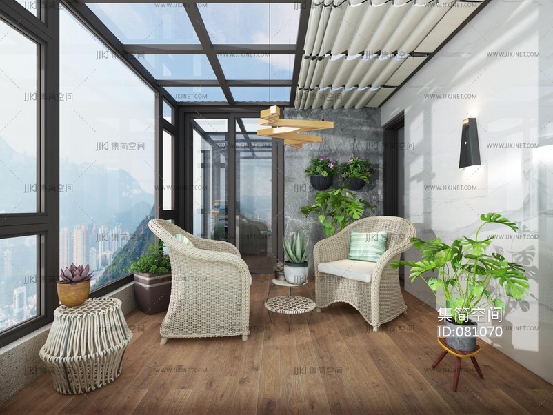 现代阳光房阳台,户外藤编休闲椅子 3d模型下载 [模型ID:81070]