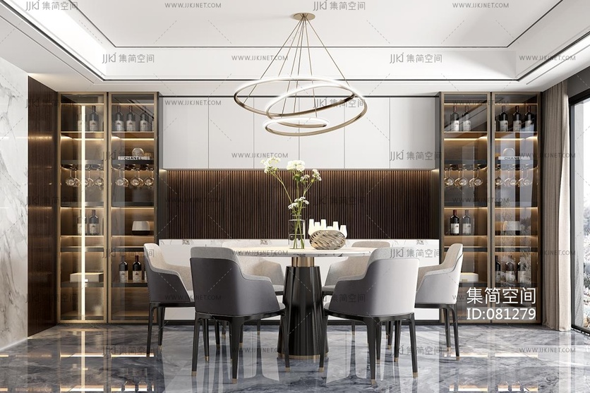 轻奢餐厅,圆形餐桌椅子酒柜吊灯 3d模型下载 [模型ID:81279]