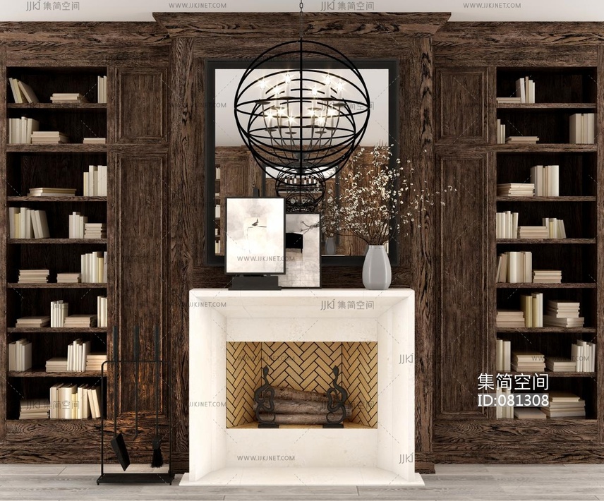 美式书柜,壁炉,铁艺吊灯 3d模型下载 [模型ID:81308]