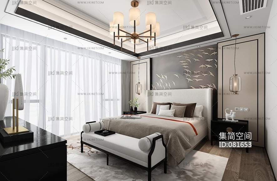 新中式样板间别墅卧室 3d模型下载 [模型ID:81653]