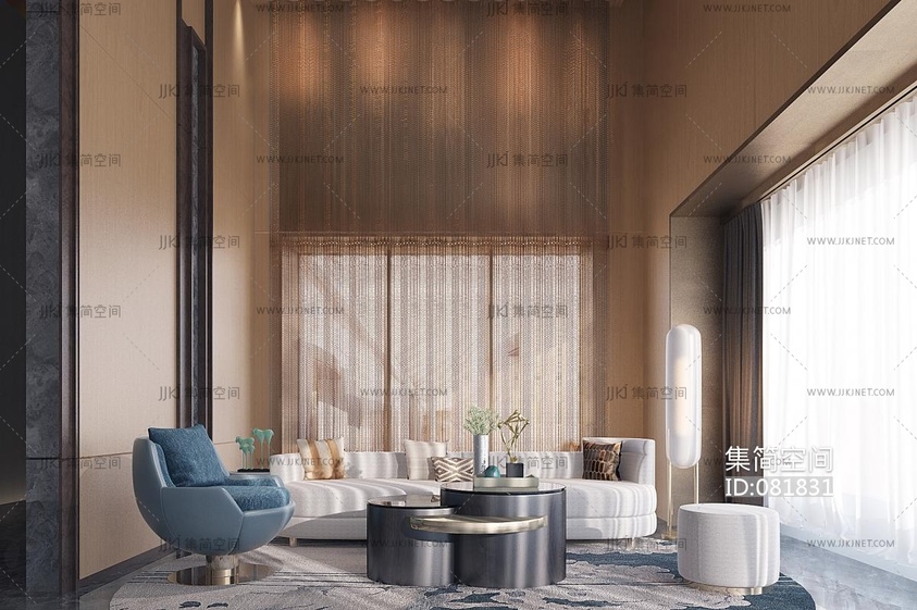 新中式大堂休息区,沙发茶几单人沙发 3d模型下载 [模型ID:81831]