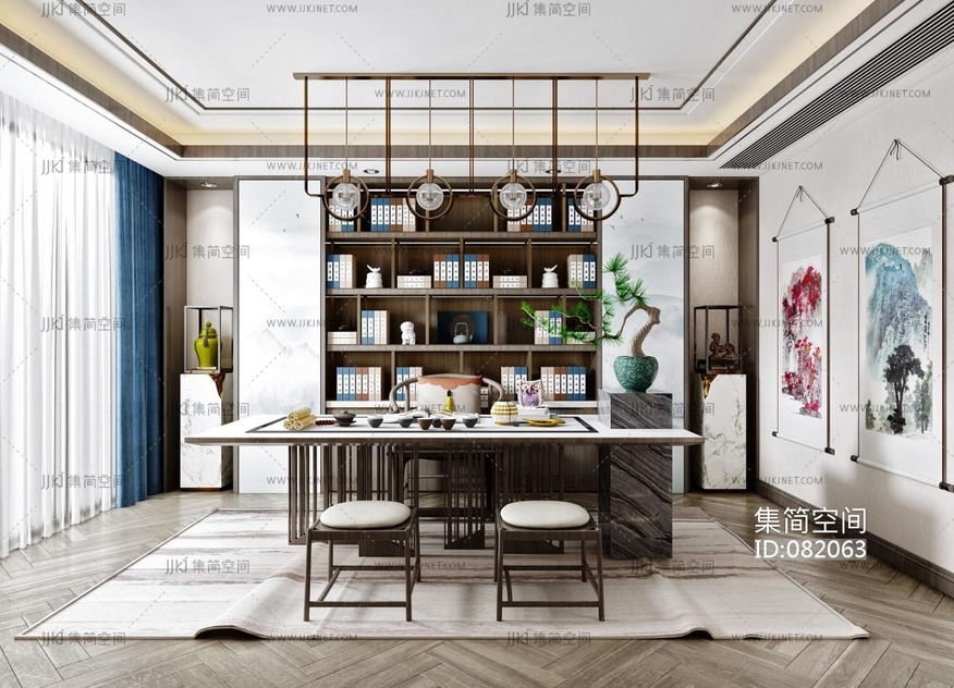 新中式书房,茶室,书柜古典书籍 3d模型下载 [模型ID:82063]