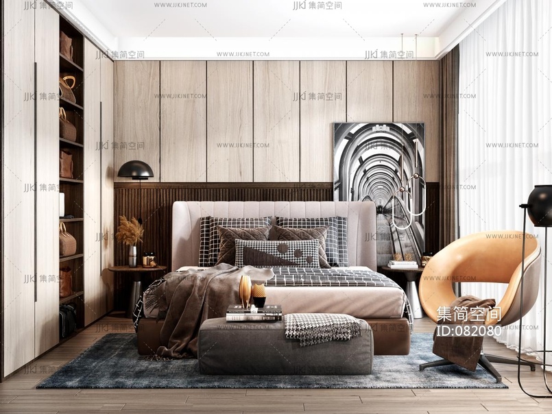 现代轻奢卧室,皮革双人床 3d模型下载 [模型ID:82080]