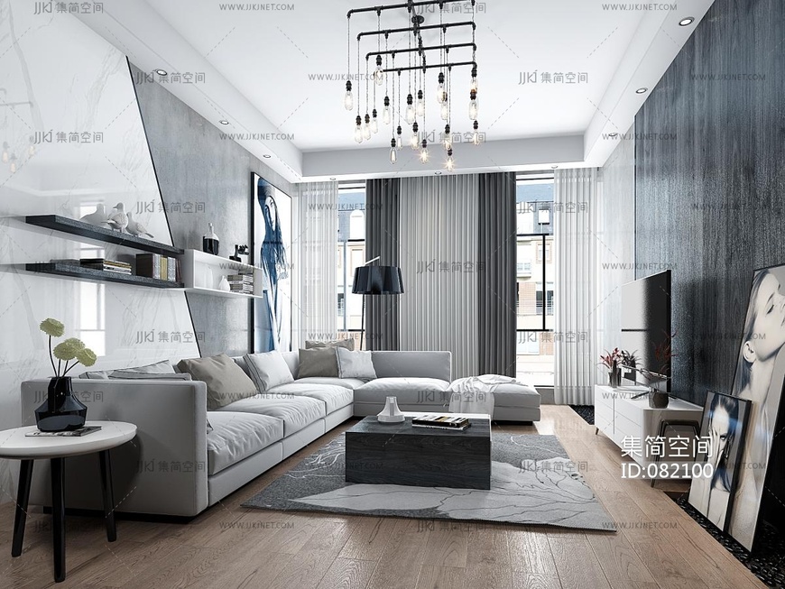 北欧现代客厅,转角沙发,工业风吊灯 3d模型下载 [模型ID:82100]