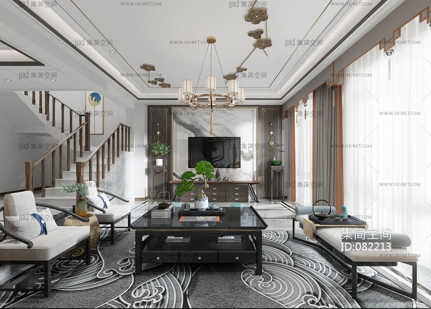 新中式复式别墅客厅, 3d模型下载 [模型ID:82213]