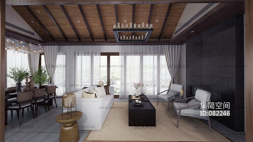 新中式东南亚会客厅,客餐厅,藤编餐桌椅子组合 3d模型下载 [模型ID:82246]