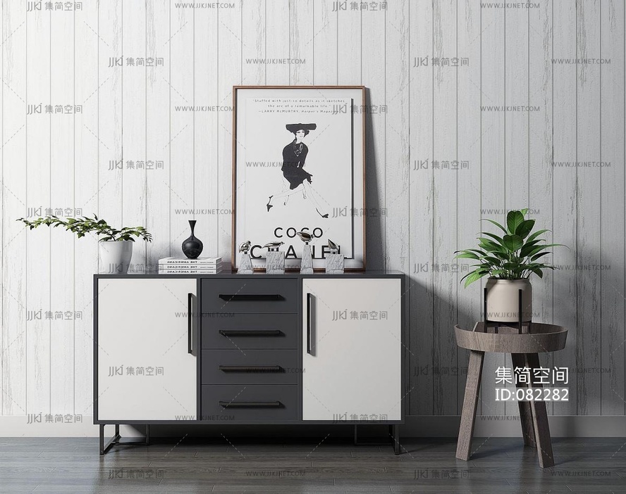 黑色玄关柜装饰画盆栽摆件,边柜 3d模型下载 [模型ID:82282]