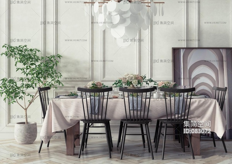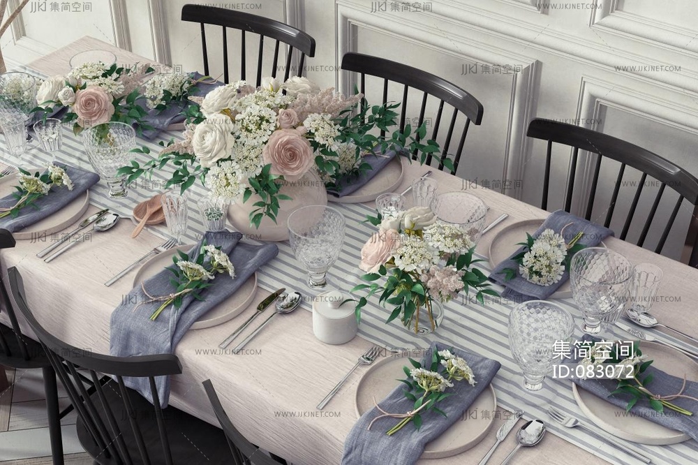 北欧现代餐桌椅,桌布餐桌,餐具花盆盆栽绿植 3d模型下载 [模型ID:83072]