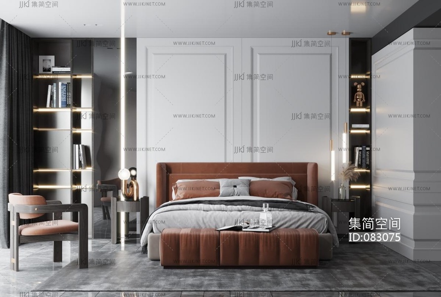 卧室,轻奢,暗黑风,现代轻奢卧室双人床,懒人沙发法式卧室3d模型下载
