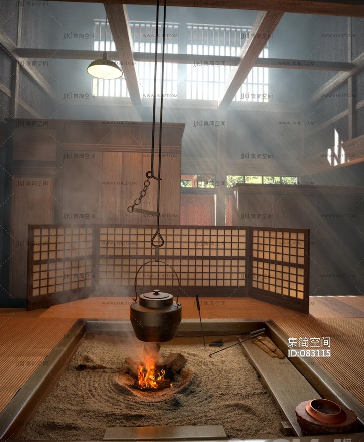 日式榻榻米茶室,火堆,茶壶 3d模型下载 [模型ID:83115]