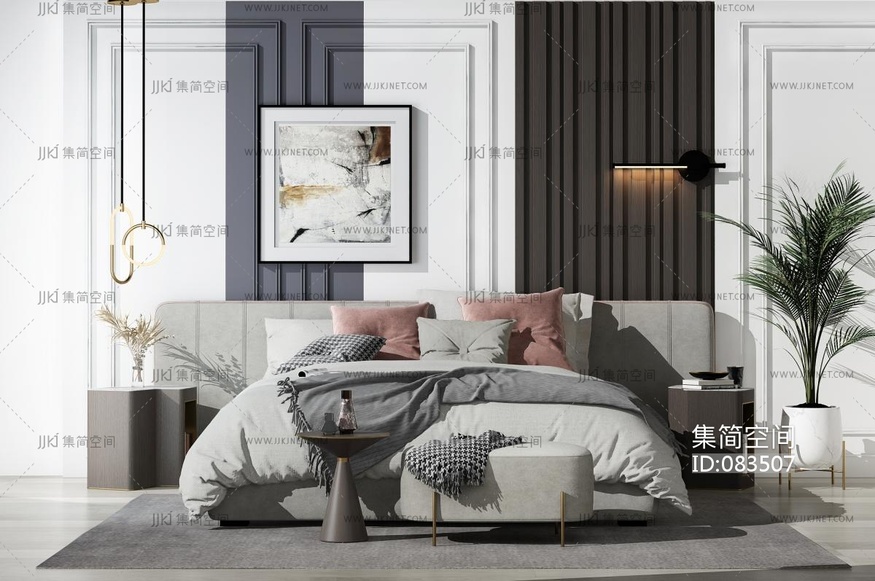1北欧现代双人床,散尾葵盆栽 3d模型下载 [模型ID:83507]