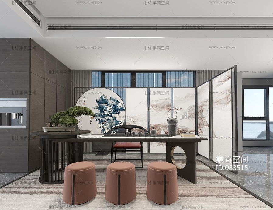 新中式茶室,茶桌椅,茶台盆景屏风 3d模型下载 [模型ID:83515]