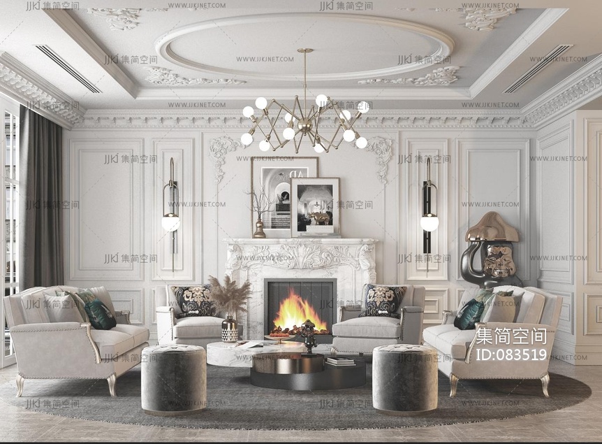 欧式法式美式客厅沙发茶几单人沙发护墙板,壁炉 3d模型下载 [模型ID:83519]