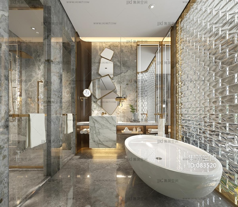 新中式卫生间,浴缸洗手台,玻璃砖隔断,洗漱用品 3d模型下载 [模型ID:83520]