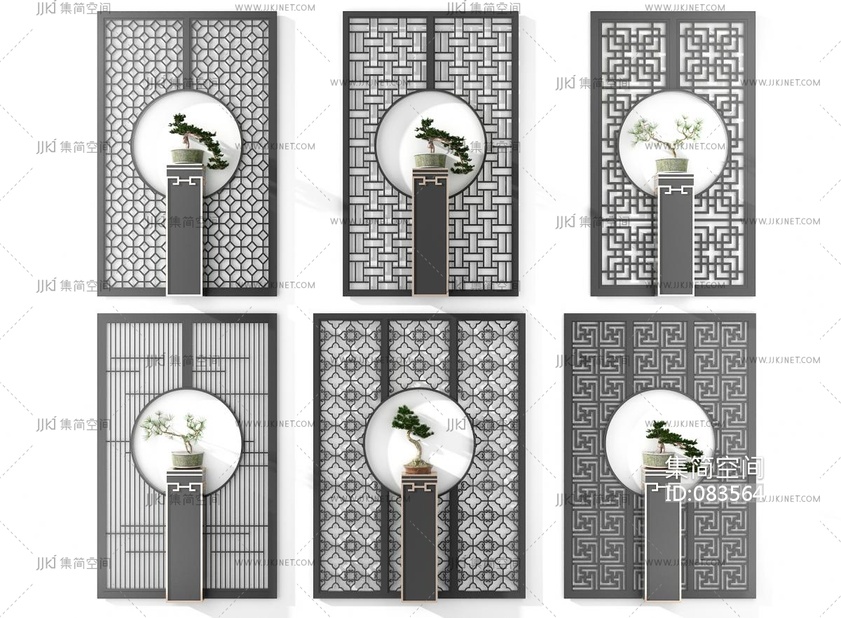 中式屏风花格屏风隔断,摆台盆景 3d模型下载 [模型ID:83564]