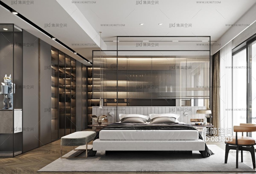 卧室,轻奢,暗黑风,现代轻奢卧室双人床,懒人沙发法式卧室3d模型下载