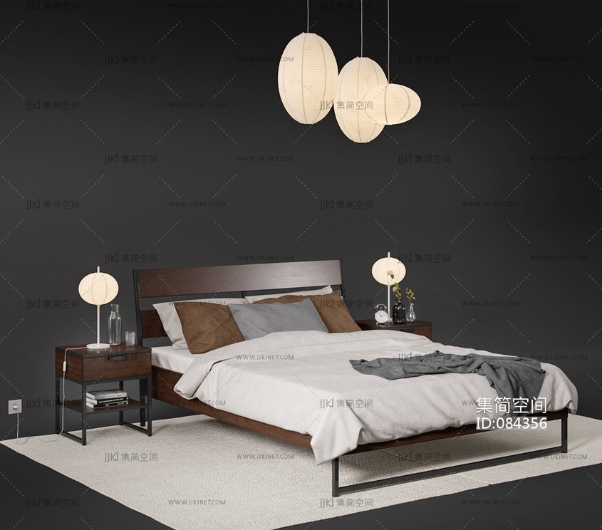 宜家木质床双人床,新中式日式灯笼吊灯台灯 3d模型下载 [模型ID:84356]