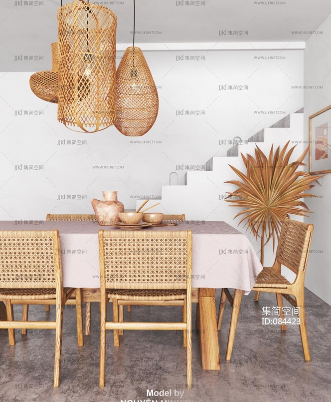 自然风民宿,藤编编织餐桌椅,椅子吊灯 3d模型下载 [模型ID:84423]