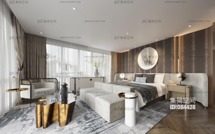 卧室,轻奢,暗黑风,现代轻奢卧室双人床,懒人沙发法式卧室3d模型下载