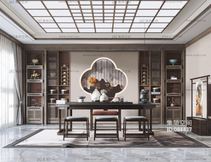 新中式风格茶室书房,书桌椅茶台书柜 3d模型下载 [模型ID:84437]