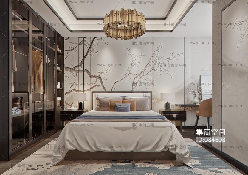 新中式卧室,双人床床头柜,衣柜 3d模型下载 [模型ID:84608]