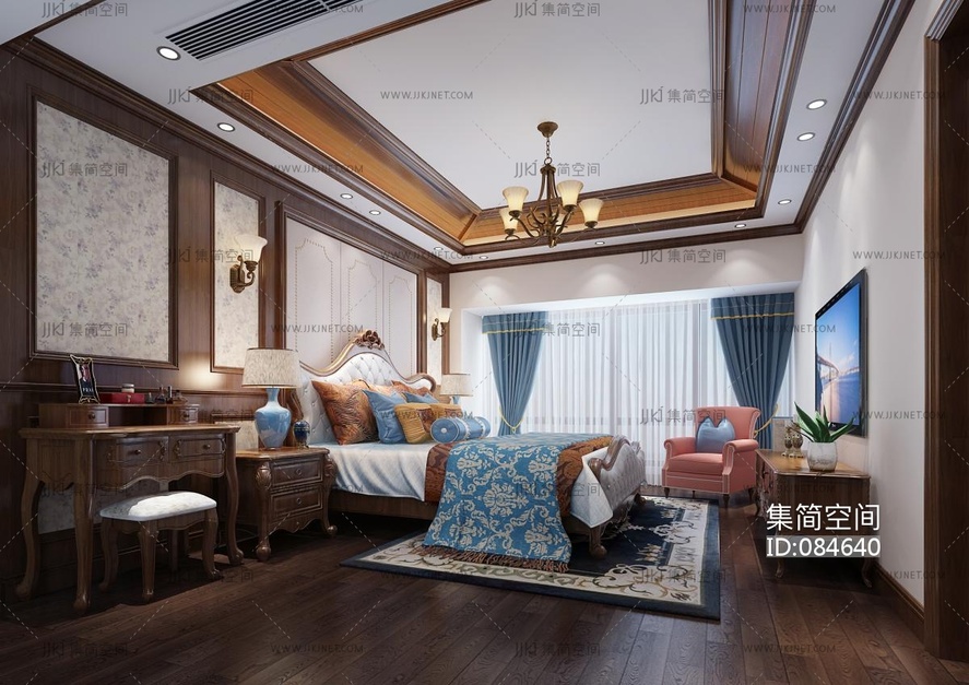 美式欧式卧室,雕花双人床,床头柜,梳妆台 3d模型下载 [模型ID:84640]