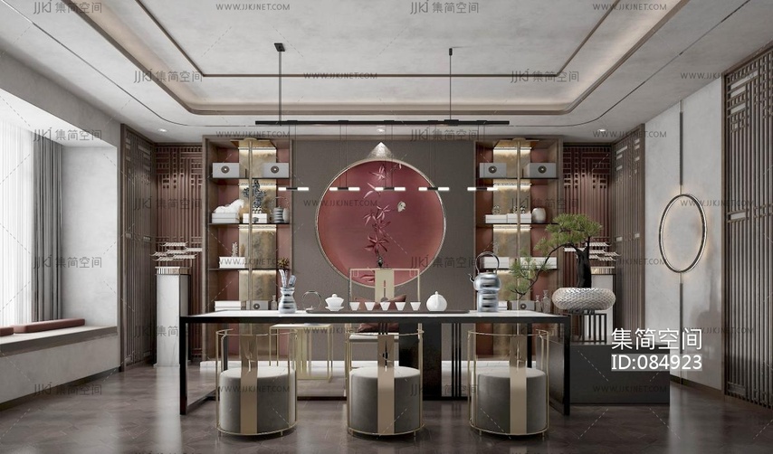 新中式茶室,茶桌椅,书架 3d模型下载 [模型ID:84923]
