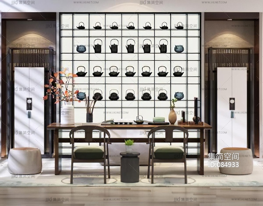 新中式茶室,茶具茶壶,装饰柜,茶桌椅 3d模型下载 [模型ID:84933]