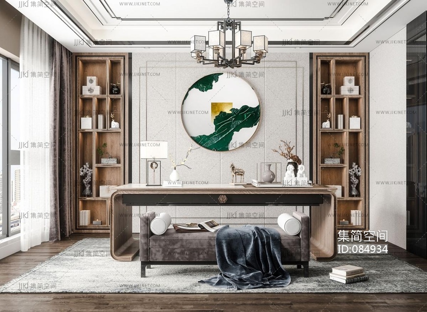 新中式书房茶室,书桌椅茶桌椅,书柜摆件 3d模型下载 [模型ID:84934]