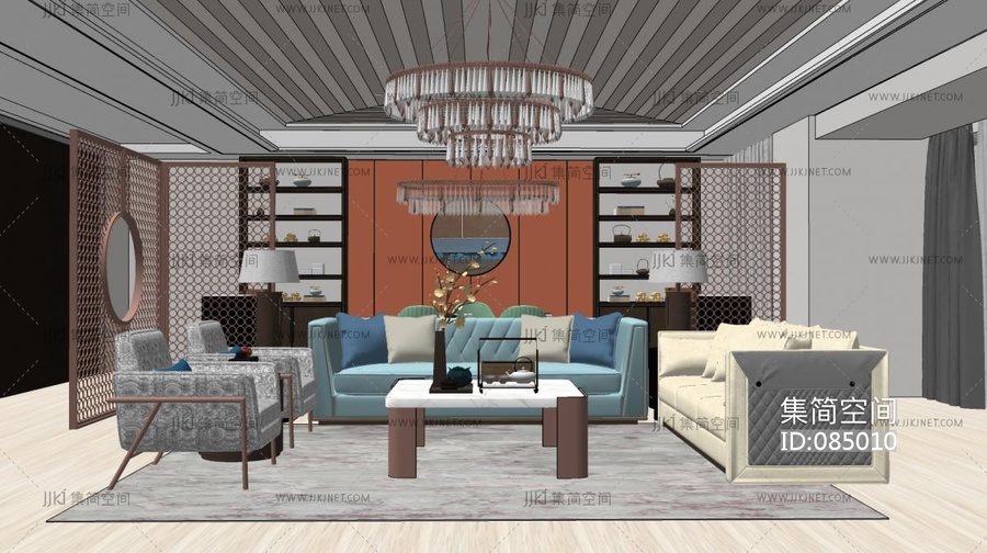 现代新中式客餐厅, su草图模型下载 [模型ID:85010]