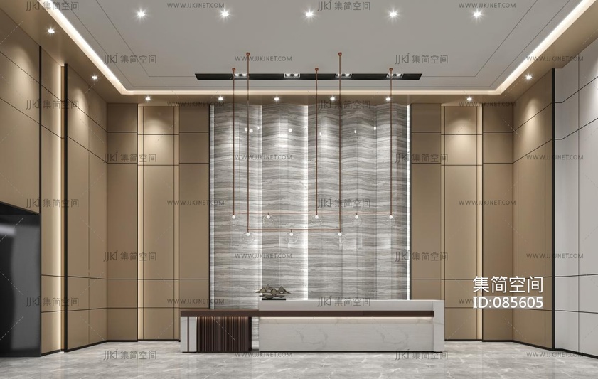 新中式酒店会所办公大堂大厅前台接待 3d模型下载 [模型ID:85605]