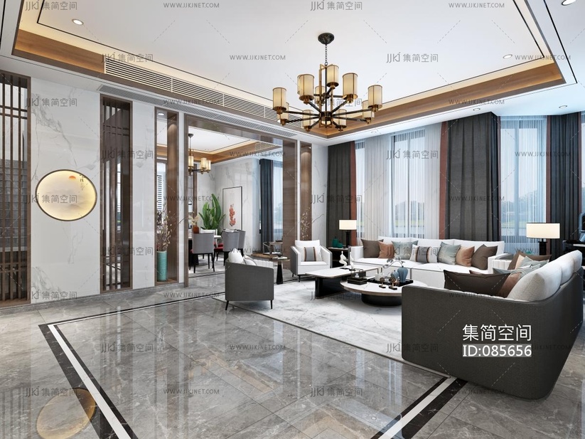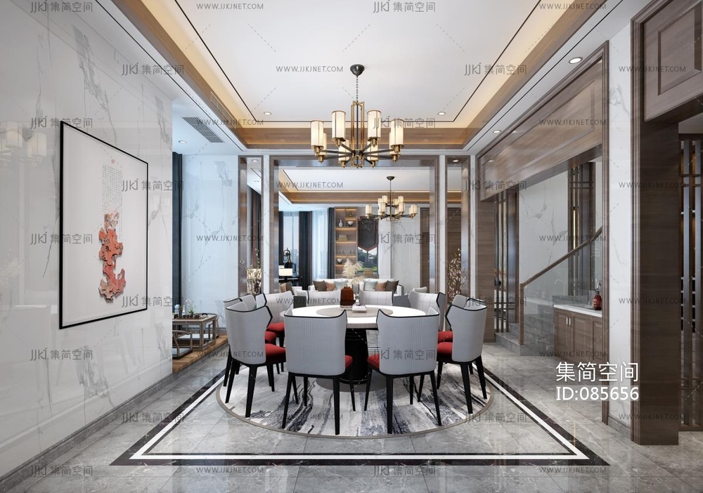新中式客餐厅,沙发餐桌椅 3d模型下载 [模型ID:85656]