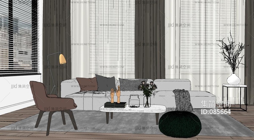 z08-0530现代客厅,沙发,茶几单人椅子,吊灯 su草图模型下载 [模型ID:85664]