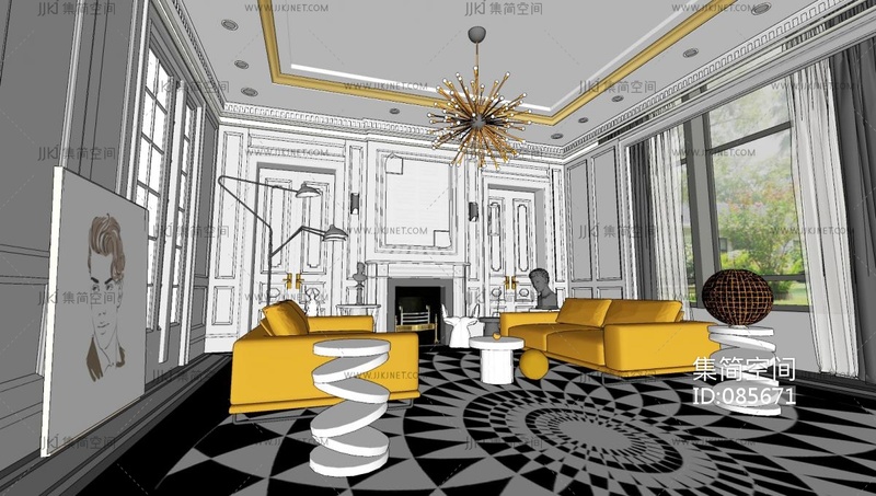 z14-0530简欧法式客厅现代,沙发,摆台,壁炉,金属吊灯 su草图模型下载 [模型ID:85671]