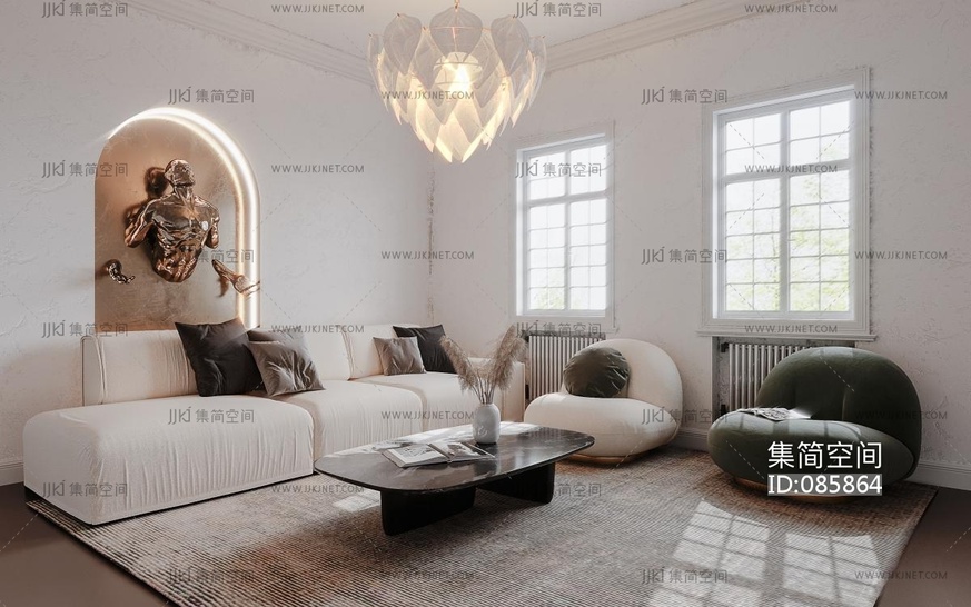 现代客厅木沙发,单人沙发抽象人物墙面雕塑,树叶吊灯 3d模型下载 [模型ID:85864]