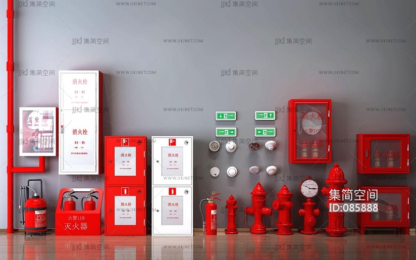 消防栓灭火器消防箱,消火栓,微型消防站,灭火器,应急照明灯安全出口消防器材设备 3d模型下载 [模型ID:85888]