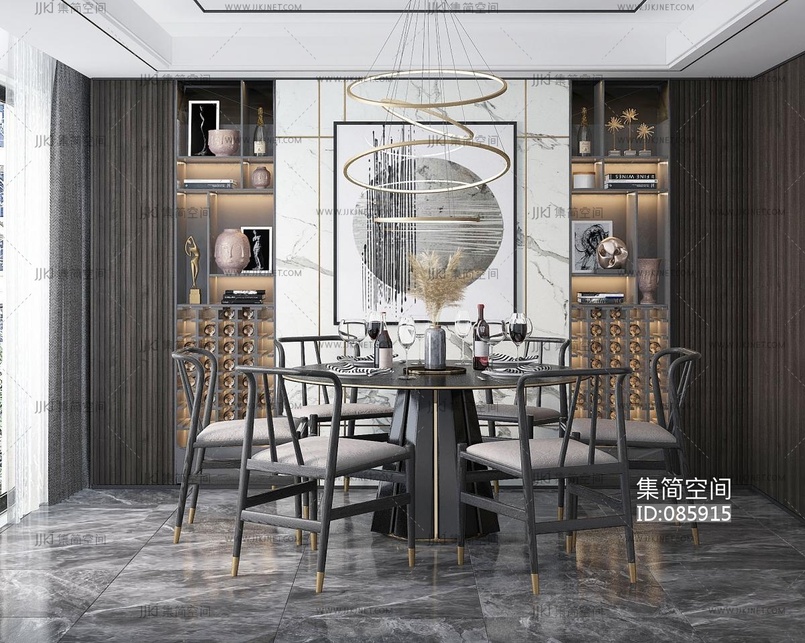 新中式餐厅餐桌椅酒柜 3d模型下载 [模型ID:85915]
