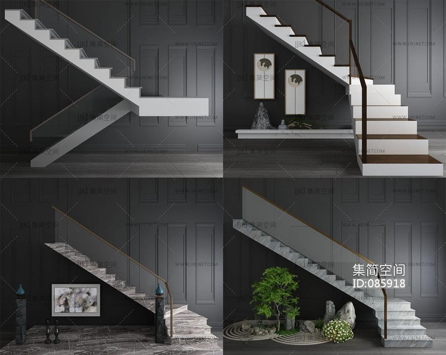 新中式楼梯玻璃扶手栏杆现代楼梯盆栽盆景装饰画组合 3d模型下载 [模型ID:85918]