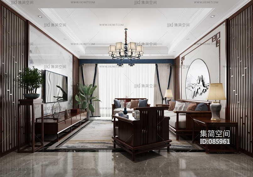 新中式客厅,实木沙发电视柜 3d模型下载 [模型ID:85961]