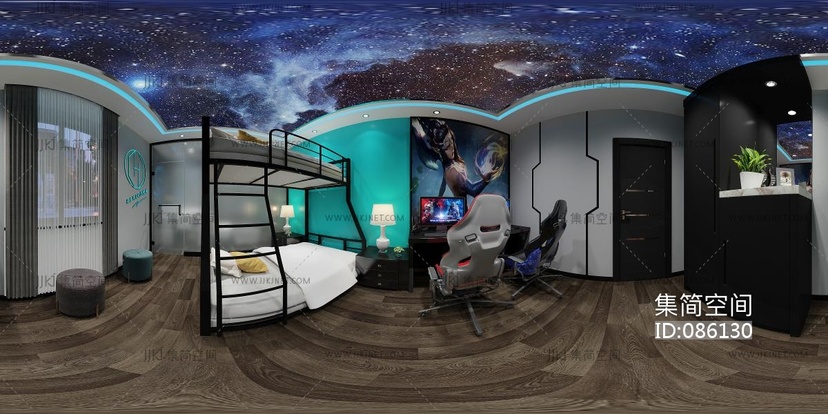 电竞酒店上下床,上下铺,电脑椅子主题客房 3d模型下载 [模型ID:86130]