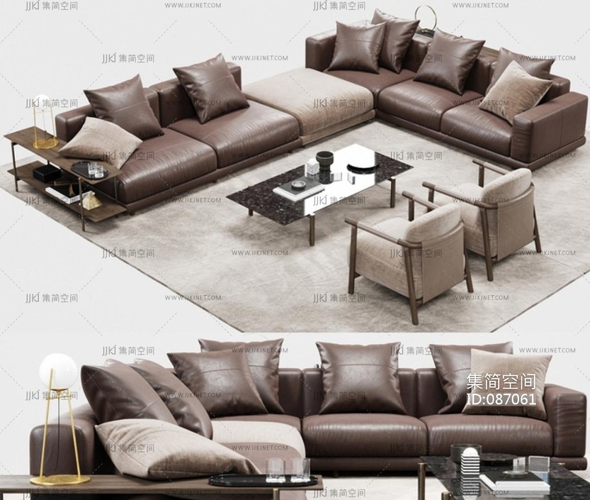 皮革转角沙发茶几单椅组合 3d模型下载 [模型ID:87061]