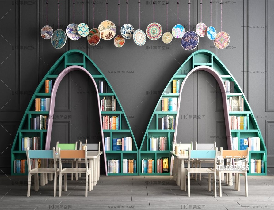 儿童桌椅书架,幼儿园课桌椅书架,书柜 3d模型下载 [模型ID:87256]