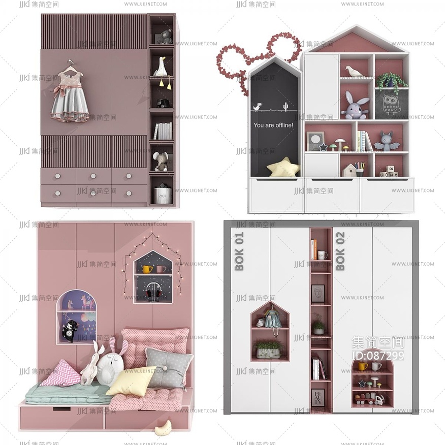 北欧儿童,女孩房女儿房书柜衣柜装饰柜,收纳柜,玩具柜储物柜 3d模型下载 [模型ID:87299]