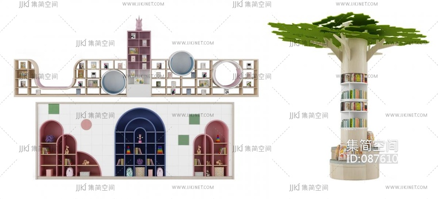儿童书柜装饰柜组合,柱子造型树造型柱子, 3d模型下载 [模型ID:87610]